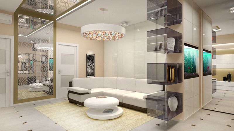 Необычным приёмом трансформации помещения могут являться многоуровневые потолки. Они имеют способность визуального разграничения комнаты, т. е. разграничивают зоны квартиры. Часть потолка будет разумно оформить в отличных красках, эта идея будет выглядеть очень заманчиво.